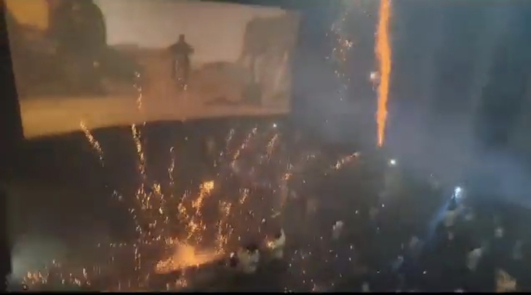 A stampede-like atmosphere in the cinema hall due to fireworks.